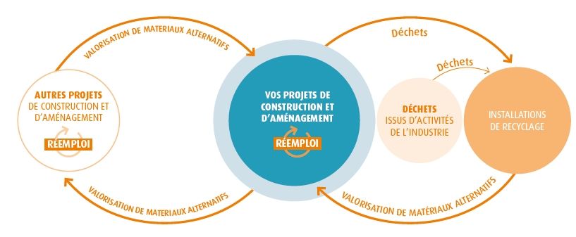 La figure ci-dessous illustre l’organisation territoriale des boucles vertueuses de l’économie circulaire des matériaux générés par un chantier : du réemploi à la valorisation via des installations de recyclage transformant des déchets en matériaux alternatifs.