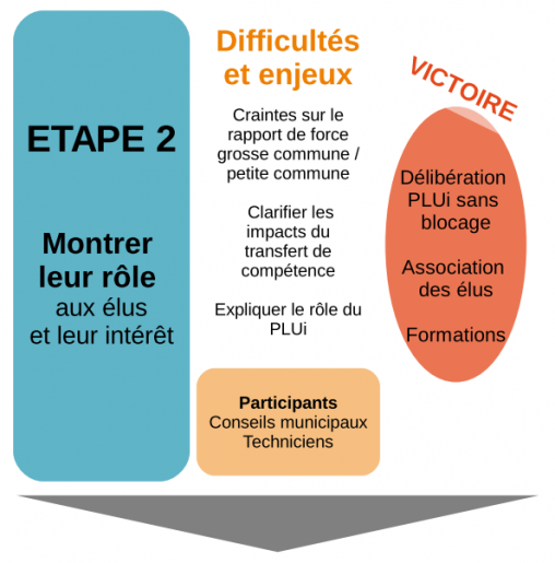 Les points d’arrêt de cette étape, constituant des victoires, seraient d’une part une délibération de lancement du PLUi sans blocage ou opposition majeure, des formations organisées en interne par exemple sous la forme de compagnonnage entre communes, et l’association forte des élus lors de la construction du PADD.