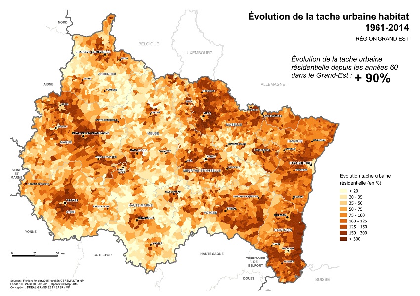 La DREAL Grand Est qui contribue à la plate-forme du foncier, a présenté en introduction de la journée un état des lieux de la consommation du foncier dans le Grand est. Cet état des lieux réalisé avec différentes sources de données permet de faire le constat d’une forte consommation d’espaces naturels, agricoles et forestiers et d’une augmentation de la tâche urbaine non corrélée avec l’évolution (plus faible) de la population. La comparaison avec les régions et pays limitrophes met en évidence une surconsommation de foncier dans le Grand Est.