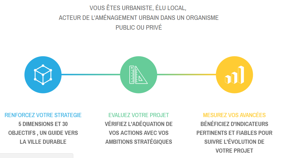 Le ministère de la cohésion des territoires porte les politiques publiques de l'Etat en faveur d’un aménagement durable et innovant des territoires. A cet effet, il développe des outils et des dispositifs ayant pour vocation d’aider et d’accompagner les territoires dans l’élaboration et l’évaluation de leurs démarches de transition écologique. Accompagné par le Cerema, le ministère a notamment piloté l’initiative de conception et d’animation d’un outil d’aide à la décision, le référentiel européen des villes et territoires durables: « Reference Framework for Sustainable Cities » (RFSC). Ce référentiel commun existe sous la forme d’un site internet à disposition des collectivités européennes (www.rfsc.eu).