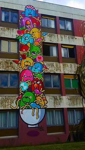 Street Art City : vue de l'hôtel 128.Street Art City à Lurcy-Lévis (Allier): Un site entièrement dédié à l'art urbain, avec des espaces d'exposition, de galerie et de restauration et une résidence d'artistes, a été créé en 2017 dans un ancien centre des PTT qui ne sera pas détruit. 22.000 mètres carrés de murs sont offerts à l'expression des artistes de street art. Le projet est né suite au rachat par des particuliers de l'ancien centre de formation de France Télécom, sur 10 hectares, et à l'envie de créer un lieu dédié à l'art urbain. Les propriétaires ont d'abord invité des graffeurs à utiliser les murs, puis le lieu a été ouvert au public, et grâce à un fort écho médiatique Street Art City a accueilli 25.000 visiteurs dès 2018. Aujourd'hui plus de 80 artistes sont passés par la résidence et des centaines de toiles ont été vendues.