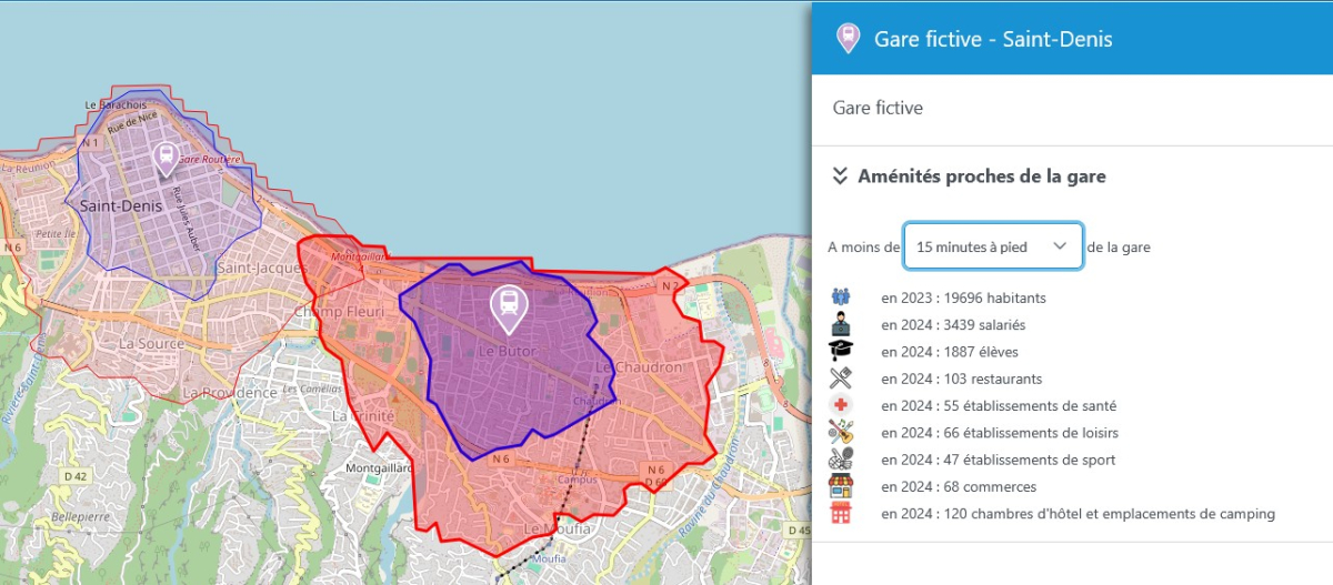 L’une des forces de Géofer réside dans les analyses territoriales permises par la connaissance des données de population, de salariés, de scolaires et d’aménités autour des gares (dans des isochrones de 15 minutes à pied, 30 minutes à pied soit environ 10 minutes à vélo, et 10 minutes en voiture).