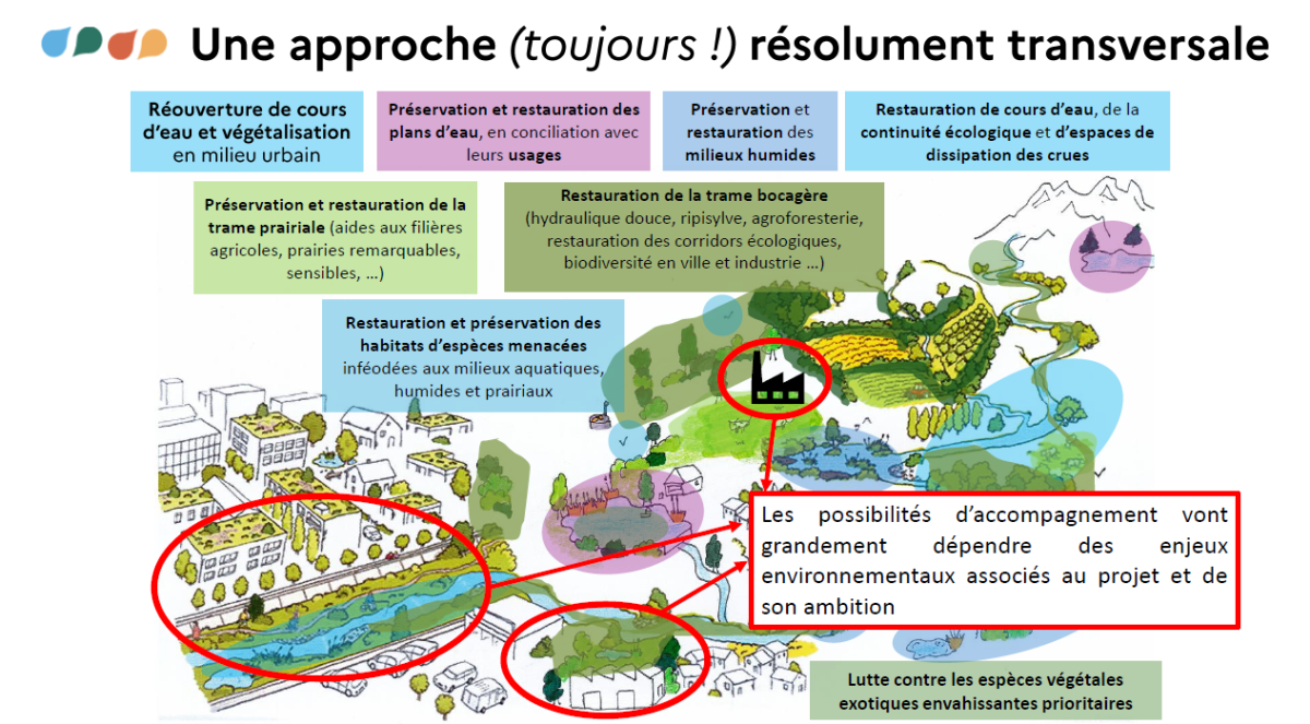- Agence de l’Eau Rhin-Meuse : son intervention porte sur la restauration écologique des friches, notamment pour les sites impactant les milieux aquatiques. Elle finance des actions de renaturation (désimperméabilisation, création de zones humides) ou de gestion transitoire pour favoriser la biodiversité, en complément des dispositifs de dépollution. Ces aides s’articulent avec les objectifs de continuité écologique, de préservation des ressources en eau et de gestion intégrée des eaux pluviales.
