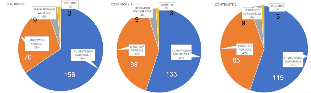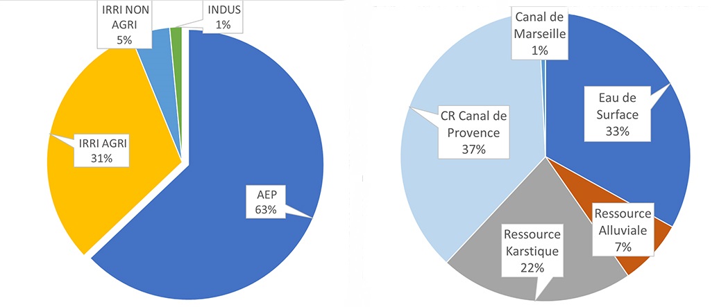 L’étude Var Eau a permis de dresser le premier panorama complet de l’ensemble des usages de l’eau dans le département. Ainsi, en 2021, le volume total brut utilisé dans le Var est estimé à 217 Mm³. L'eau potable représente 63 % (138 Mm³), l'irrigation agricole 31 % (67 Mm³), et les autres usages (arrosage, industrie) environ 6 % (~13 Mm³). Globalement, environ 60 % de l'eau utilisée provient de ressources locales varoises, et 40 % d'imports extérieurs (essentiellement via le Canal de Provence).