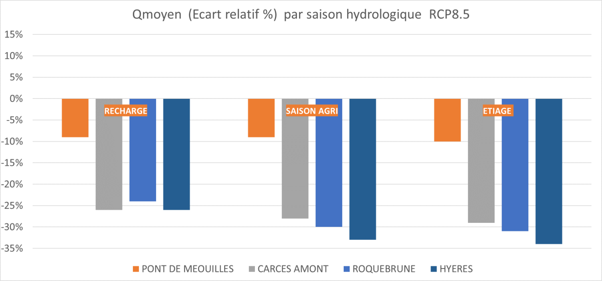 D'après les projections climatiques (scénarios RCP 4.5 et 8.5, DRIAS 2020, Explore 2), le Var se dirige vers un climat plus chaud en 2050, marqué par des vagues de chaleur plus fréquentes et intenses. Les ressources en eau devraient globalement diminuer, avec une baisse des débits moyens annuels des cours d'eau, notamment en été et en automne. En période d'étiage, cette baisse pourrait atteindre -30 % par rapport à 1976-2005, et jusqu'à -35 % dans les scénarios les plus extrêmes.