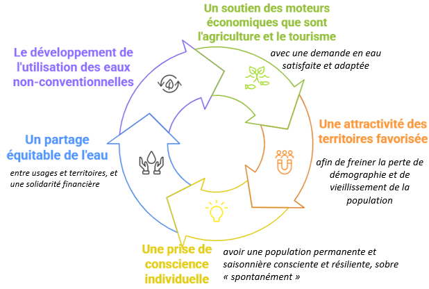 Elle s'inscrit dans la continuité des assises départementales de l'eau du 30 mai 2023, qui ont souligné la nécessité de comprendre les perturbations du cycle de l'eau, de garantir une gestion durable, d'anticiper les besoins, de maintenir l'attractivité du territoire, et de soutenir les activités économiques et agricoles. Une restitution a été réalisée lors de la seconde édition des assises départementales de l’eau le 26 juin 2025.