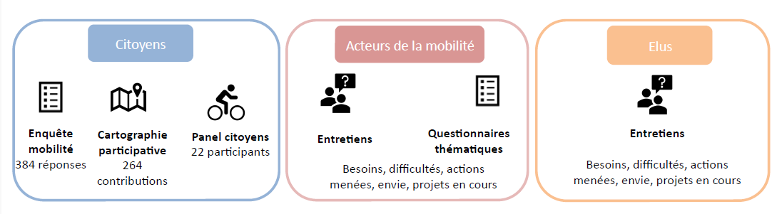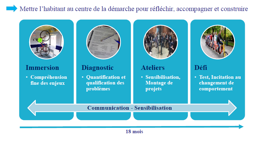 Tout d’abord, dans une phase stratégique, d’élaboration d’un plan des mobilités alternatives et durables. C’est ce qu’a présenté la communauté de communes du Val d’Amboise, qui a mobilisé de nombreux outils pour aboutir à ce plan : questionnaire, cartographie participative, panel citoyens, entretiens techniques, ateliers thématiques. Ainsi, le questionnaire et la cartographie ont permis d’affiner le diagnostic, alors que les entretiens et ateliers ont permis d’avancer sur la stratégie et le plan d’action. Au-delà de cette approche fonctionnelle, ce retour d’expérience fait aussi apparaître la diversité des publics à faire participer. Il s’agit d’une part des citoyens ou des collectifs organisés, mais aussi, dans une communauté de communes, de l’ensemble des acteurs institutionnels : région, département et communes, chacun ayant des compétences propres à mobiliser pour la réussite du projet.