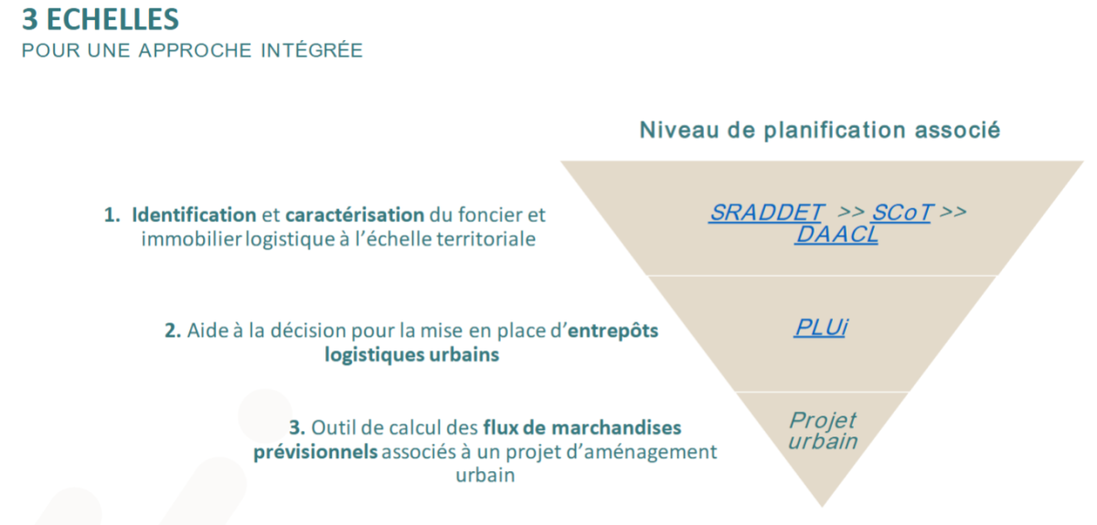 Le projet "Prise en compte du foncier logistique" d’InTerLUD+ a donc pour objectif de donner sa place à la logistique dans les politiques d’aménagement en respectant les impératifs des EPCI (décongestion, décarbonation, réduction de la pollution, apaisement de la circulation) tout comme ceux des acteurs économiques (foncier qui répond au besoin, différenciation par typologie d’acteur et de flux de marchandises).