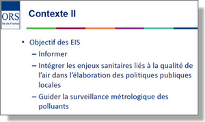 Les niveaux de pollution atmosphérique couramment observés en zone urbaine présentent des risques sur la santé. Des risques à court et à long terme et des associations ont pu être établies. La nature causale de la relation entre la mortalité et la PA est considérée comme plausible notamment grâce aux apports de la toxicologie. Et de fait on peut appliquer ces relations pour réaliser des EIS.