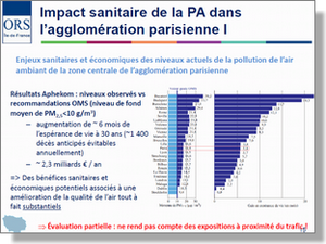 L’étude APHEKOM a mis en évidence un gain possible de 6 mois d’espérance de vie (à 30 ans) pour Paris et sa proche couronne en ramenant les valeurs moyennes des concentrations de fond aux recommandations de l’OMS (PM2,5 : 10 µg/m3 ). Il s’agit d’une évaluation partielle sans prise en compte de l’exposition à proximité des axes.