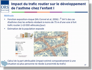 Si on déroule le raisonnement sur l’agglomération parisienne, en évaluant la population résidant dans des bandes de 75m de part et d’autres d’axes (recensement de l’INSEE croisé avec le bâtiment) on décompte 2 M de personnes dont 70 000jeunes de moins de 17 ans. En utilisant la relation précédente on évalue que 16 % des cas d’asthmes pourraient être dus au trafic.
