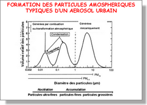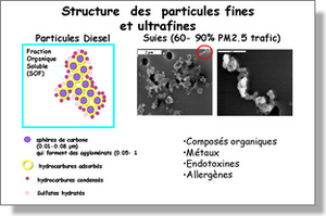 Globalement les particules les plus grossières (10µm-2,5µm) sont essentiellement constituées de poussières minérales. Les particules ultrafines sont constituées à 70 % de noir de carbone et de composés organiques.