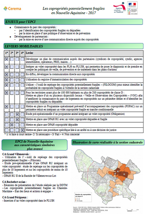 En Nouvelle-Aquitaine, aucune stratégie globale n’a encore été mise en place vis-à-vis des copropriétés potentiellement fragiles, même si des initiatives locales s'organisent progressivement. La Direction Régionale de l'Environnement, de l'Aménagement et du Logement (DREAL) Nouvelle Aquitaine a décidé de recenser les initiatives prises par les établissements publics de coopération intercommunale (EPCI) de la région et de les aider en leur proposant de définir un plan d’actions.
