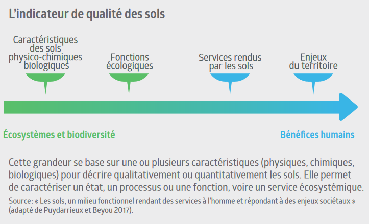 Même si les concepts de qualité et de santé des sols demeurent des sujets de débat au sein de la communauté scientifique, ils peuvent tous les deux être associés à une vision fonctionnelle des sols. La qualité des sols s’intéresse à la capacité des sols à exercer des fonctions et la santé du sol aux fonctions exercées par les sols à un instant T en lien avec des usages et des pratiques.