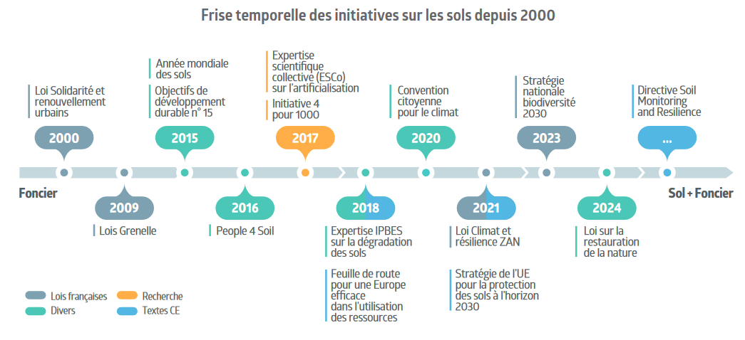 Elle s’appuie sur le fait qu’une augmentation annuelle du stock de carbone dans les sols de 4 pour 1000, soit 0,4 %, permettrait de réduire l’augmentation de la concentration en CO₂ dans l’atmosphère. Elle encourage la séquestration du carbone à travers la mise en œuvre de pratiques agricoles adaptées. Il existe également des initiatives de la société civile (comme People for Soils) et politiques (récente proposition de loi sur la protection des sols au Sénat). Au niveau national, dans le prolongement des objectifs européens, le plan Biodiversité (2018), la loi Climat & résilience (2021) et la Stratégie nationale pour la biodiversité 2030 constituent de véritables leviers pour intégrer la ressource sol dans les enjeux de territoire et passer d’une vision purement foncière à une vision plus qualitative. Le projet de directive européenne sur la surveillance et la résilience des sols (dite de surveillance des sols) de 2023 constitue un élément supplémentaire en établissant un cadre juridique afin de parvenir à un bon état des sols de l’Union européenne d’ici à 2050.