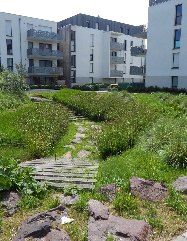 - La gestion des eaux pluviales en intégrant les dispositifs de récupération, infiltration ou stockage de l’eau de pluie pour limiter les dégâts liés aux pluviométries importantes ;