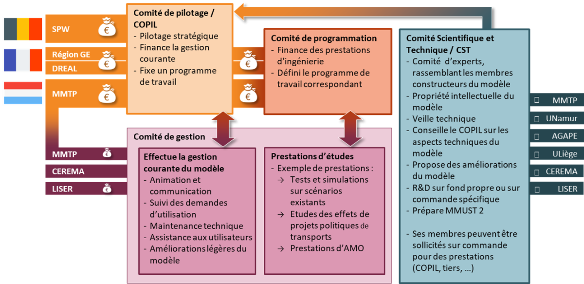 Depuis janvier 2023, une gouvernance partagée entre la France, le Grand-Duché du Luxembourg et la Belgique a été mise en place pour maintenir le modèle et effectuer des simulations à l’échelle transfrontalière destinées à objectiver les choix d’investissement, d’aménagement et d’organisation des réseaux de transport.