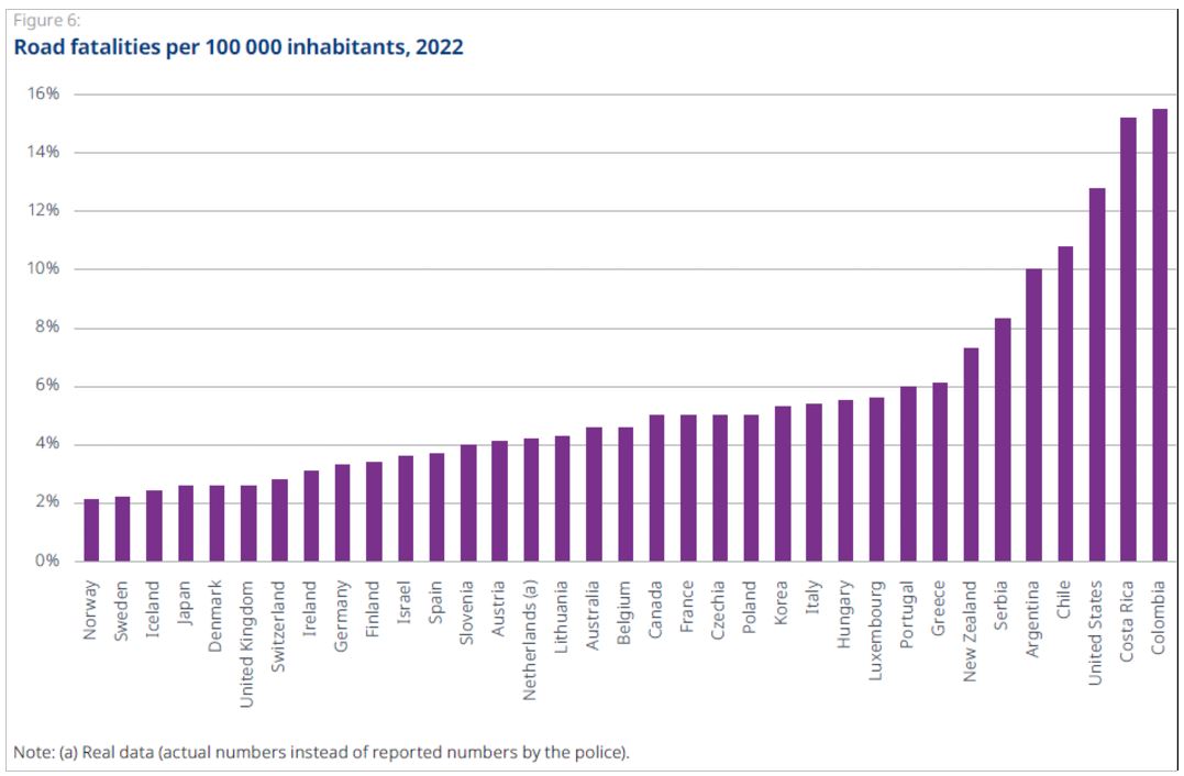 En 2022, sur les dix pays ayant le taux de mortalité le plus faible, 9 sont en Europe, dont l’Islande, la Suède et la Norvège pour les trois meilleurs. La France se situe au 18ᵉ rang (sur les 35 pays de la base IRTAD), au même niveau que le Canada.