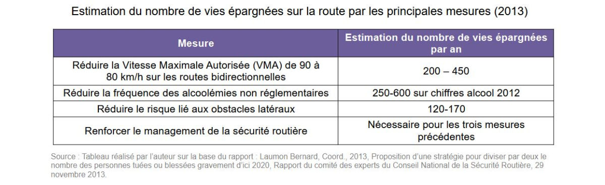 L’exercice n’a pas été actualisé, mais l’évaluation du Cerema (2020), ainsi que les travaux de recherche de Carnis et Garcia (2024), concluent que l’abaissement de la vitesse maximale autorisée à 80 km/h a permis d’épargner entre 300 et 350 vies en France, validant en quelque sorte les estimations faites en 2013.