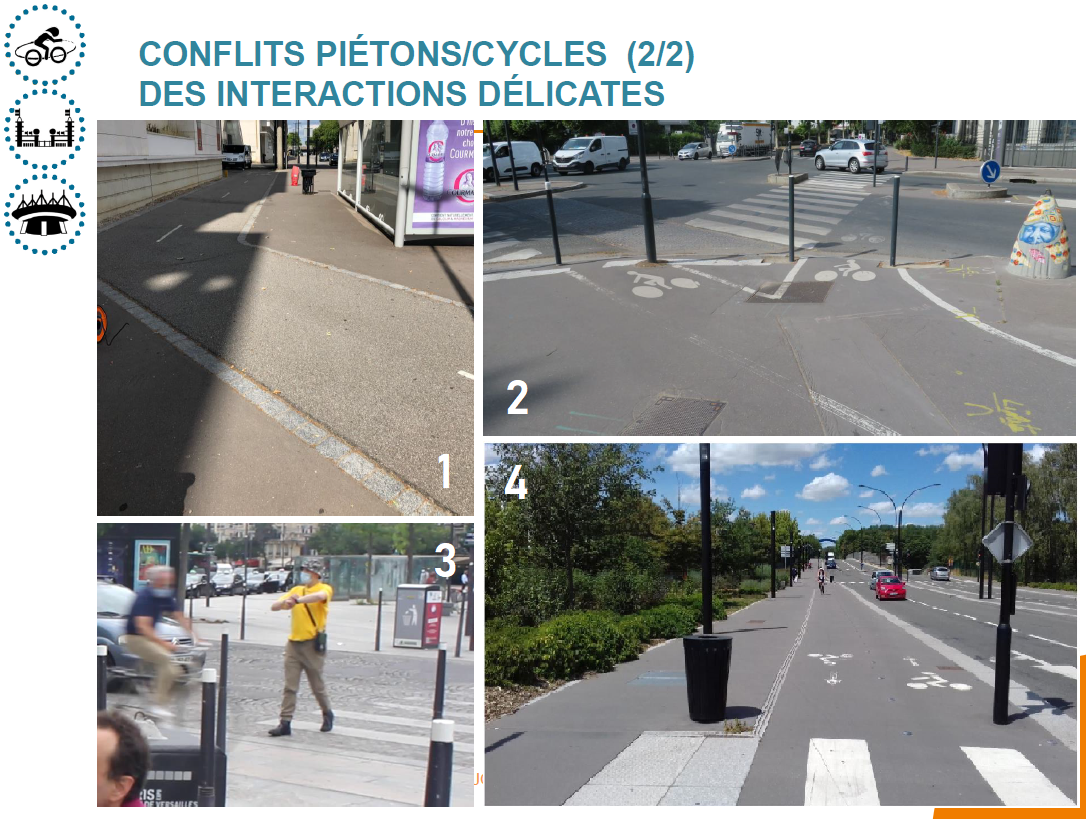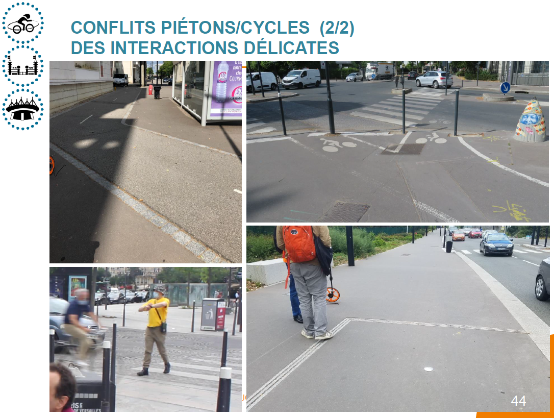 3 - La traversée piétonne de la piste cyclable, lorsqu’elle se fait dans la continuité de la traversée de la chaussée circulée et à l’occasion d’un feu piéton vert, peut être perturbée par le manque de respect de l’obligation de s’arrêter de la part des cyclistes. Ces situations de frôlement, qui peuvent paraître anodines, sont réellement anxiogènes pour les personnes vulnérables.