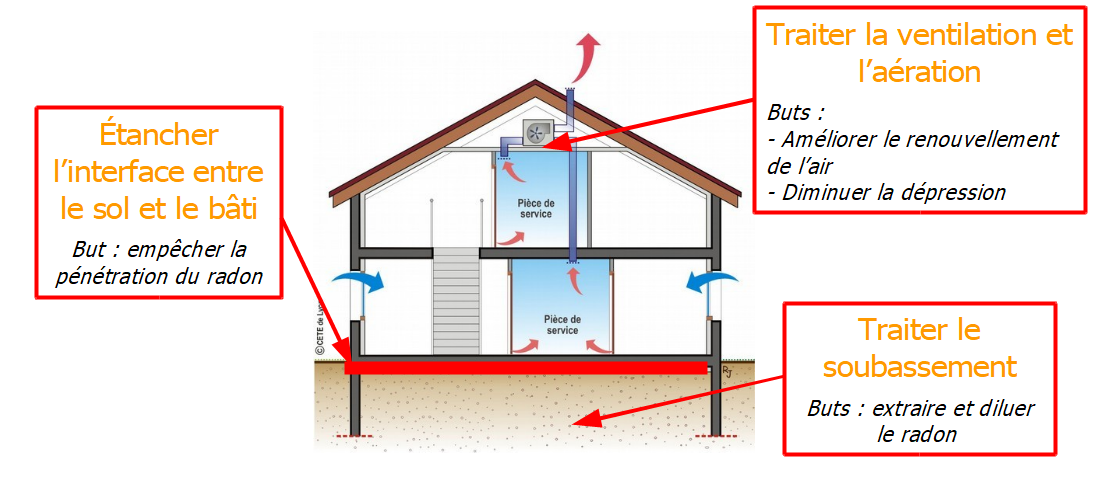 • En priorité 1 d'empêcher le radon de pénétrer dans le bâtiment et de rectifier les dysfonctionnement du système de ventilation mécanique par insufflation en place,