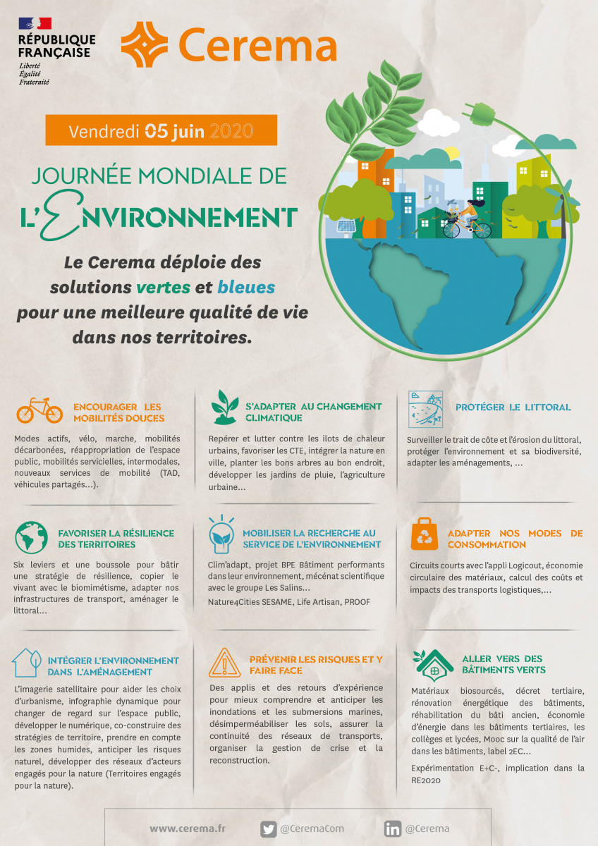 Pour la journée mondiale de l'environnement, un panel de solutions vertes et bleues déployées par le Cerema dans les territoires: mobilités douces, adaptation au changement climatique, protection du littoral, résilience des territoires, recherche, risques, aménagement, bâtiment de demain...