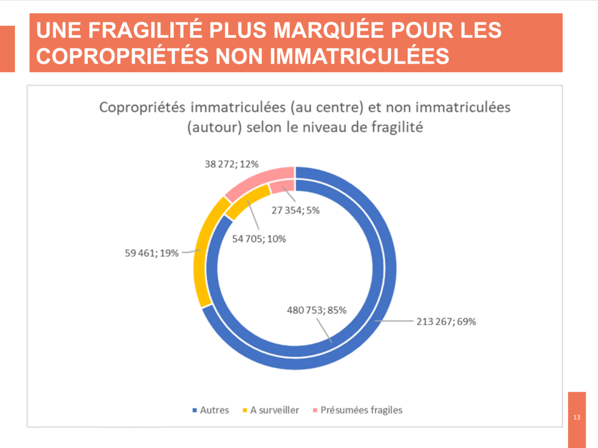 Des données de cadrage issues de cette nouvelle méthode ont pu être partagées ainsi qu’une comparaison des résultats issus de la méthode historique qui reposait sur Filocom. Deux seuils nationaux sont proposés, l’un ciblant les copropriétés obtenant la note de synthèse de fragilité la plus élevée (dites "présumées fragiles") et l’autre élargissant le repérage à des copropriétés dites "à surveiller". Les premières représentent de l’ordre de 7,5% des copropriétés et 4,6% des logements en copropriété quand les secondes pèsent 13 % des copropriétés et 7 % des logements en copropriété.