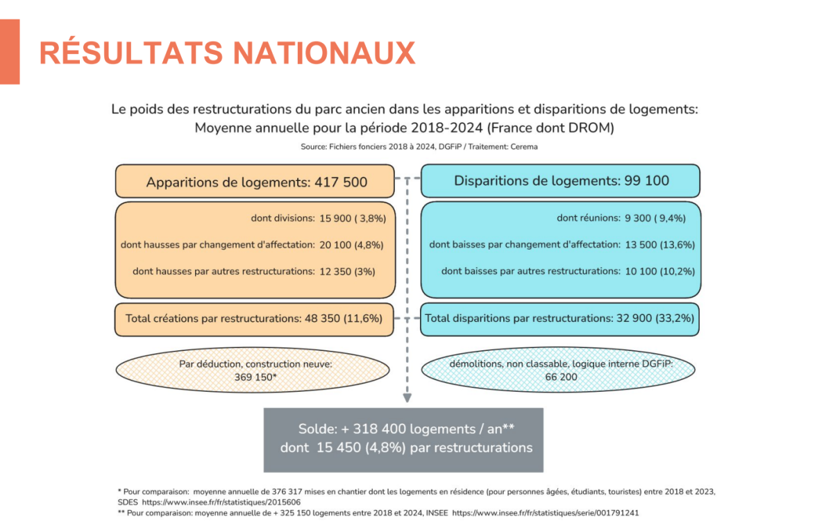 Moyennant ces précautions, 318 400 logements supplémentaires par an sont ainsi recensés en moyenne entre 2018 et 2024 en France DROM compris. Les restructurations représentent de l’ordre de 12% des 417 500 nouveaux logements qui apparaissent dans les bases fiscales chaque année en moyenne sur cette période.