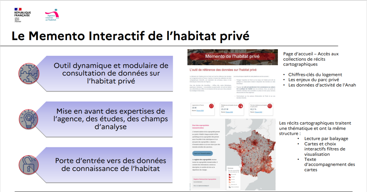 L’Anah développe d’abord le Mémento Interactif de l’habitat privé, outil dynamique et modulaire de consultation de données sur l’habitat privé et de mise en avant des expertises de l’agence, des études, des champs d’analyse. Cette porte d’entrée à destination du grand public se complète du site "outil de connaissance du parc privé", accessible aux services déconcentrés et aux collectivités territoriales. Plusieurs modules thématiques y sont disponibles, sur le Pré-repérage de l’habitat indigne ou encore le Référentiel national des copropriétés. Ces supports ont vocation à évoluer, l’Anah souhaitant s’orienter vers un Portail National de l’Habitat privé à terme.