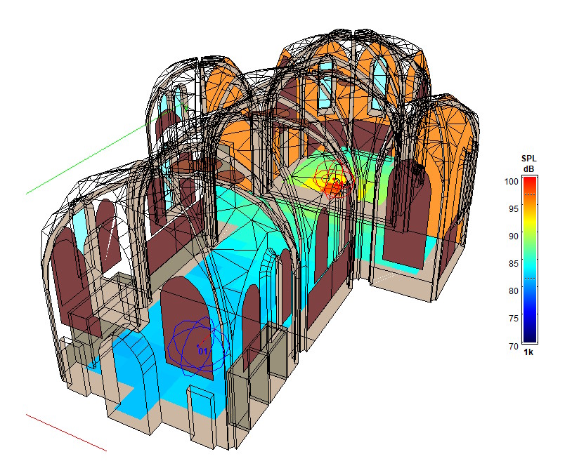 Une campagne de mesures in-situ conformes aux normes en vigueur a été réalisée sur une demi-journée pour mesurer le temps de réverbération et compléter les plans de la salle. Les données sur la configuration de la salle ont été intégrées au logiciel CATT-Acoustic, pour la modéliser en 3D et donner à chaque matériau un coefficient acoustique. Cette étape a permis de reproduire fidèlement le comportement sonore de la salle et de tester virtuellement différents scénarios d’aménagement avant toute intervention réelle. Ce rendu très visuel et pédagogique facilite l'appropriation des résultats par la collectivité ainsi que sa communication.