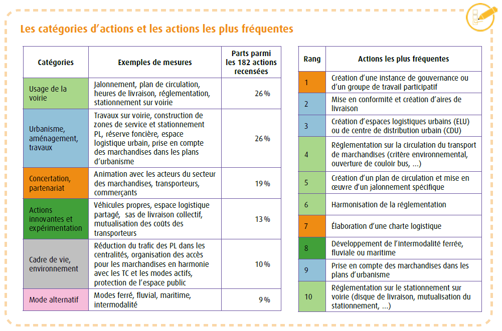 Par ailleurs, le plan d’action doit inscrire la logistique urbaine dans toutes les temporalités en associant des mesures à court terme (réglementation par exemple) à des actions de fond (identification dans les PLU des terrains à enjeux liés aux marchandises, animation continue d’un groupe de travail dédié, ...).