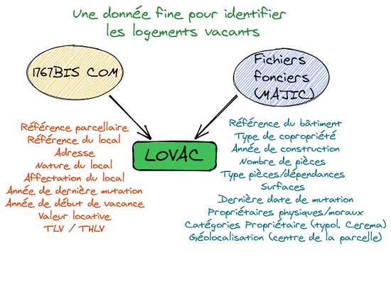 Pour produire l’outil LOVAC, le Cerema a croisé les données sont basées sur les informations du fichier 1767BISCOM, produit par la DGFiP (Direction Générale des Finances Publiques), enrichie par des informations des Fichiers fonciers. Concrètement, le Cerema intervient sur le traitement de la donnée (fabrication des millésimes de Lovac en croisant Fichiers fonciers et fichiers 1767biscom), leur diffusion (après instruction des demandes par la DGALN), ainsi que l'assistance aux utilisateurs (à travers la boîte aux lettres fonctionnelles datafoncier@cerema.fr, sur le site Datafoncier) et l'information des utilisateurs (site Datafoncier, lettre d'information des données foncières, webinaires, journée nationale des données foncières).