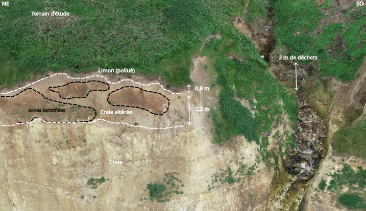 Image drone de la décharge communale de Sotteville-sur-Mer - Sarah Thuilier - Cerema À Sotteville-sur-Mer (76), les analyses ont révélé des déchets jusqu'à 1,5 m de profondeur sous une couche de sol résistante. Cette ancienne décharge communale a montré des variations de résistivité confirmant l'accumulation de polluants. Ces résultats ont été jugés pertinents pour planifier les futures actions de réhabilitation et de gestion des risques liés à l’érosion.