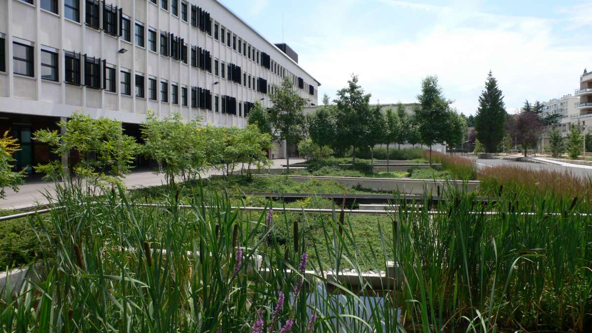 Le Cerema a publié un ouvrage dans lequel différents exemples de réalisations sont mis en avant, comme la rénovation du lycée Saint-Exupéry à Lyon, qui a été l'occasion de mettre en place un dispositif de gestion de l'eau de pluie.