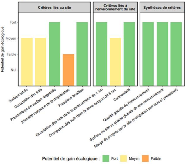 Chacun des critères est associé à une ou plusieurs variables numériques. Pour chaque site, la méthode produit une évaluation qualitative du potentiel de gain écologique (nul, faible, moyen, fort) critère par critère (Surface totale, Occupation des sols, Pourcentage de surface dégradée,….. Connectivité).