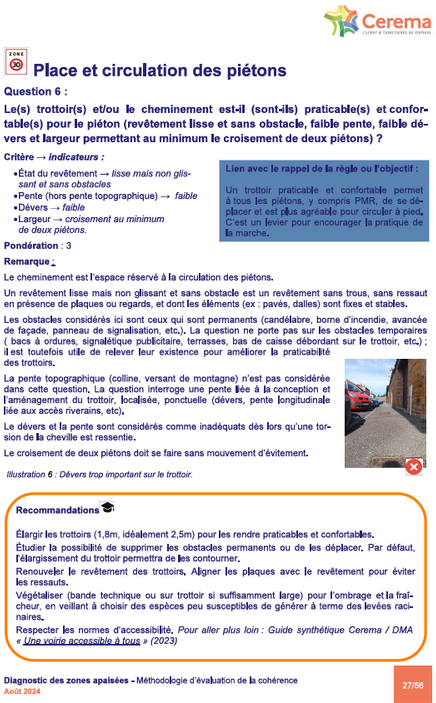 Ce questionnaire à dérouler in situ peut être renseigné numériquement sur smartphone ou tablette grâce à un outil libre de questionnaire en ligne, ou en version papier. Une aide à l’utilisation du questionnaire est fournie dans la notice méthodologique du diagnostic. Il est à noter que répondre aux différentes questions nécessite d’avoir des connaissances en aménagement de la voirie et des espaces publics.