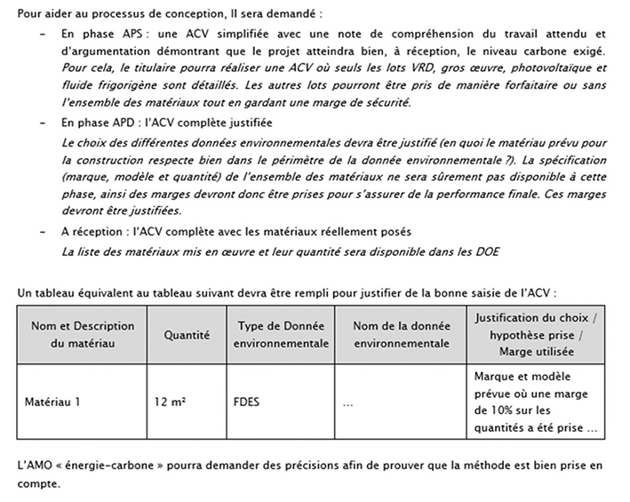 L'étude ACV (stade PRO) a été jointe au dossier de consultation des entreprises, qui devaient vérifier avant de candidater, pour leur lot, si les produits proposés dans leur réponse permettaient de maintenir la performance environnementale attendue. En cas de changement de quantité ou de produit par rapport au CCTP, l'entreprise devait remplir un tableau justificatif joint au DCE et le soumettre à l'approbation de la maîtrise d’œuvre.