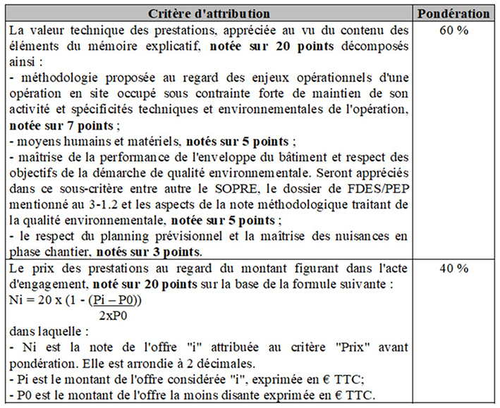 La maître d'ouvrage a stipulé dans l'objet du marché que le projet poursuivait des objectifs environnementaux ambitieux et visait les niveaux Passivhaus et E3 C1, ce qui a permis de légitimer l'utilisation d'un critère de notation environnemental comptant pour 15% de la note finale. Il était ensuite stipulé dans les CCTP des lots que le mémoire technique des offres devait comporter toutes les informations concernant les performances environnementales des produits mis en œuvre, afin de mettre en évidence leur impact carbone.
