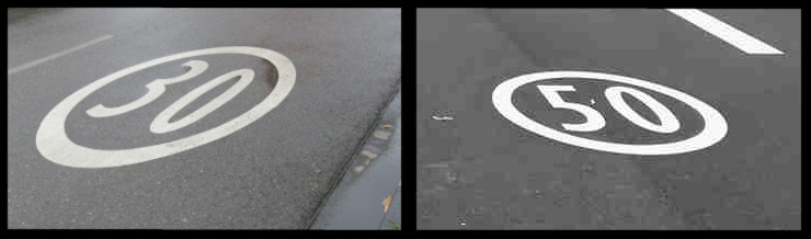 Remarque : à la place du panneau zone 30 (B30), le panneau de limitation de vitesse à 30km/h (B14) peut être également associé au panneau d'entrée (EB10). Cependant, le panneau B14 n'explicite pas la notion de zone pour un usager qui ne saurait que son association à un panneau d'entrée d'agglomération le transforme en prescription zonale. De même, le marquage de rappel par une ellipse "30" n'est possible qu'en zone 30.