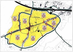 Ci-contre, l’exemple de Ploeren, avec en vert les rues à 50km/h, les zones jaunes en zones 30 (les carrés oranges sont les panneaux d’entrée de zone) et en marron une zone de rencontre en centre-ville.