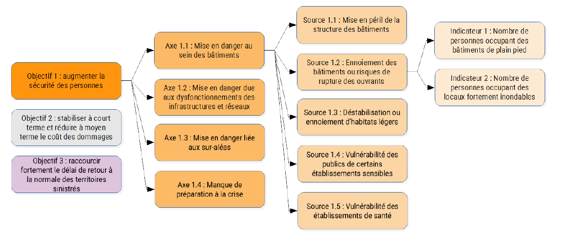 Le référentiel national propose une méthode qui repose sur l’identification pour chacun des trois objectifs de la SNGRI « d’axes de vulnérabilité » déclinés en « sources de vulnérabilité ». Chaque source est ensuite illustrée par un ou plusieurs indicateurs.