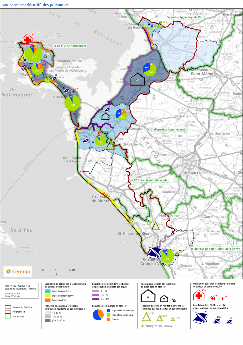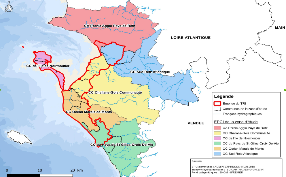 Le Cerema s’est engagé pour accompagner plusieurs territoires dans la mise en œuvre de ce référentiel dont celui concerné par le TRI de Noirmoutier/Saint-Jean-de-Monts, réparti entre cinq intercommunalités : la communauté d’agglomération Pornic-agglomération – Pays de Retz, la communauté de communes Challans-Gois communauté, la communauté de communes d’Océan-Marais de Monts, la communauté de communes du Pays de Saint-Gilles et la communauté de communes de l’Île de Noirmoutier.