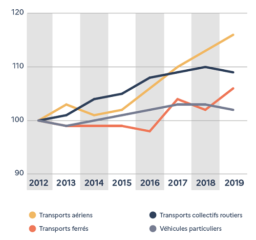Cependant, porté par la progression démographique et l’allongement des distances parcourues, le transport intérieur de voyageurs a progressé de 4,7 % entre 2012 et 2019 (en voyageurs kilomètres). Si les véhicules particuliers et les transports collectifs ont eu une évolution analogue, le transport aérien intérieur a lui progressé de plus de 15 % (source : CCTN 2020).
