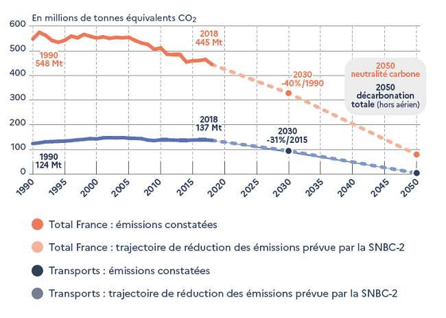 Pendant la décennie 2010-2020, le secteur des transports fait partie de ceux dont la baisse des émissions est la plus faible. Une conséquence est que le poids des transports dans les émissions totales de gaz à effet de serre est passé de 27,2 % en 2010 à 30,7 % en 2018 (il était de 22,7 % en 1990), accentuant la pression sur ce secteur et la route puisqu’elle contribue à hauteur de 94 % dans ces émissions (chiffre à peu près constant depuis 1990).