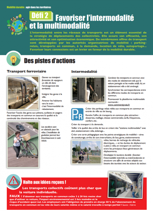Cette brochure propose aux collectivités, aux acteurs de la mobilité et de l’aménagement, des exemples concrets d’actions pour agir et innover. Son objectif ? Convaincre de l’intérêt et de la simplicité de développer la mobilité durable, donner des clés pour agir à coût réduit, inciter les collectivités à agir en conformité avec les engagements pris tant au niveau local que national voire international (accord de Paris lors de la COP21) et faire part d’innovations et de pratiques exemplaires de collectivités normandes et d’autres régions.