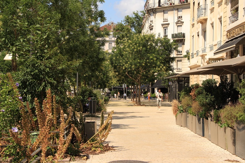 Sur un large espace actuellement très circulé en bord du centre-ville, le projet de requalification des places Delille et Salford est une piétonnisation ambitieuse quasi-intégrale, avec une végétalisation importante et une démarche de concertation large, à plusieurs niveaux, avec un public diversifié d'usagers et de riverains, y compris en intégrant les publics précaires.