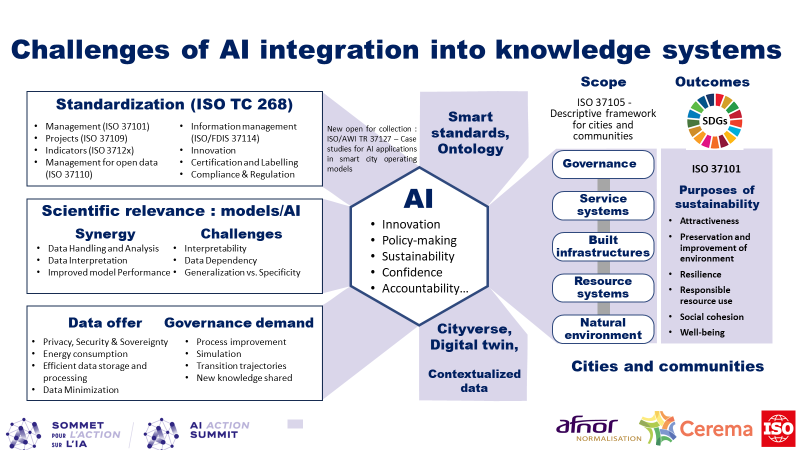 Pour répondre à ces questions, le Cerema et l'AFNOR ont organisé un séminaire de travail le 11 février 2025 au Ministère de l’Écologie, dans le cadre du Sommet de l'Action IA et de la journée " IA Frugale ", réunissant une quinzaine d'experts de différentes nationalités (Allemagne, Brésil, Chine, Royaume-Uni, France, etc.), des représentants d'organisations internationales (Université des Nations Unies, OCDE, Commission européenne, etc.), des collectivités locales ou leurs associations, comme Paris et ICLEI (local governments for sustainability), et des experts impliqués dans le processus de normalisation des villes durables et intelligentes.