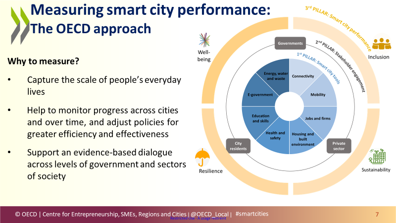 Conformément à l'idée qu'une ville n'est véritablement "intelligente" que lorsqu'elle place les personnes au centre, le cadre de mesure de l'OCDE pour les villes intelligentes repose sur trois piliers : outils numériques et d'IA, engagement des parties prenantes et résultats centrés sur les personnes.