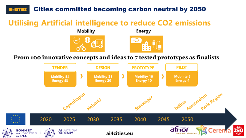 Margot De Caminel présente le projet AI4Cities, financé par la Commission européenne et réunissant les villes de Tallin, Helsinki, Stavanger, Copenhague, Amsterdam, un consortium d’acheteurs et ICLEI, en association avec le cluster français et le partenaire expert Cap Digital, afin d'utiliser l'IA pour réduire les émissions de CO2, principalement dans les thématiques de la mobilité et de l'énergie, qui représentent près de 80% des émissions de CO2, et qui sont assez faciles à traiter avec l'IA.