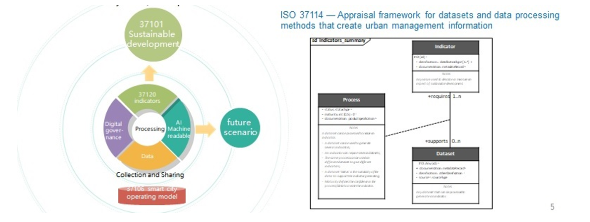 La norme 37111 est également utile en tant que document d'orientation pour les implantations urbaines réalisées selon une approche graduelle et progressive. L'ISO37114 donne ensuite des conseils pour mettre en œuvre une méthode permettant aux villes d'introduire l'IA dans la gestion des villes autour d'objectifs de durabilité, les données remplissant le modèle statique avant de lancer une évaluation...